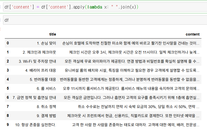 (4) content의 내용이 list 형태로 들어있으므로 join 함수를 이용해 리스트 요소를 1개의 문자열로 합친다.