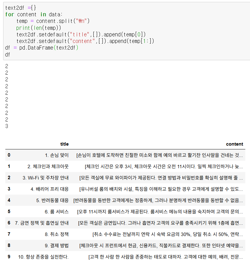 text2df.setdefault("content",[]).append(temp[1:]) # 마지막 항목이 2개로 분리 되기 때문에 슬라이싱으로 추가함
