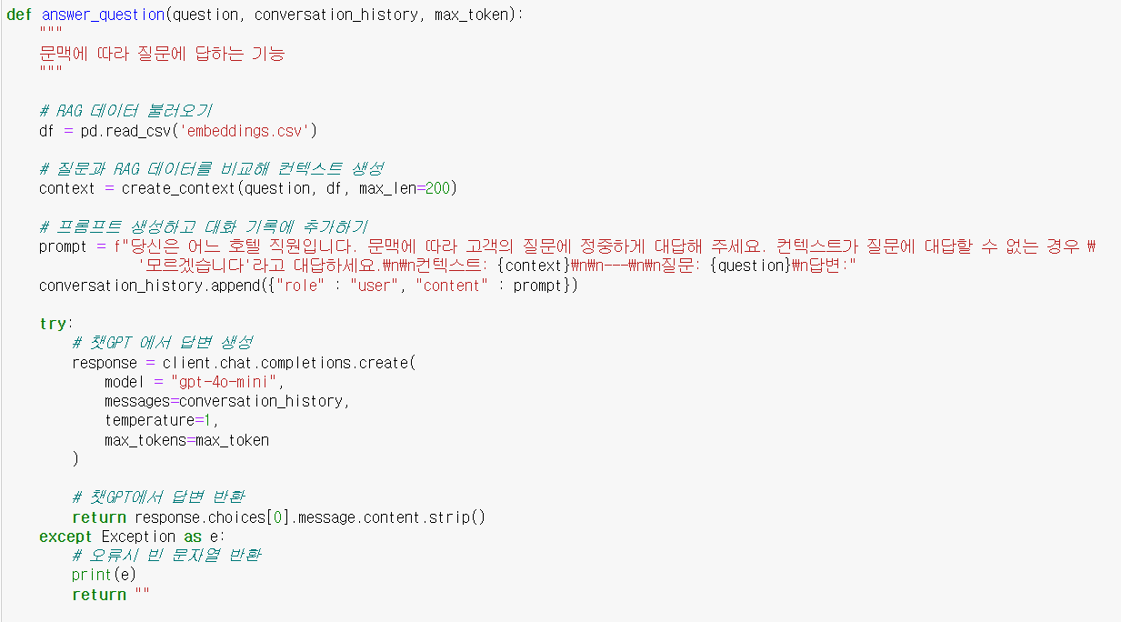 prompt = f"당신은 어느 호텔 직원입니다. 문맥에 따라 고객의 질문에 정중하게 대답해 주세요. 컨텍스트가 질문에 대답할 수 없는 경우 \