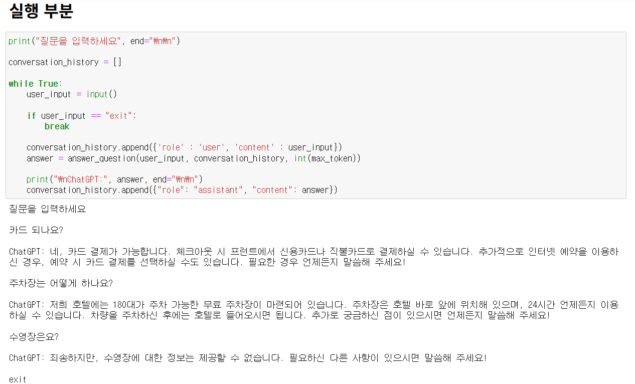 5) 위의 함수를 실행해 질문에 따른 답변을 생성 및 출력하고 exit를 입력하면 실행을 종료하도록 한다.