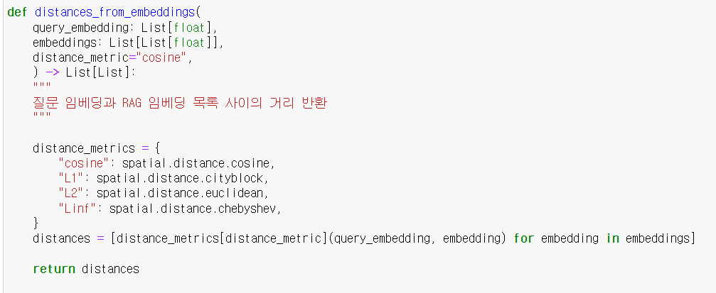 (1) 질문 임베딩과 RAG 임베딩 목록 사이의 거리 반환 함수 작성