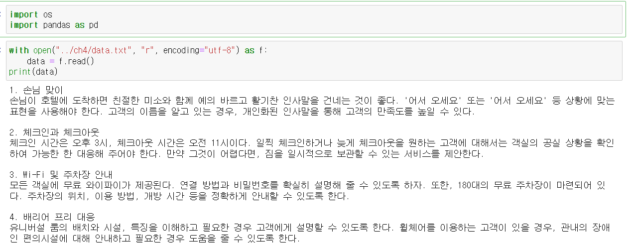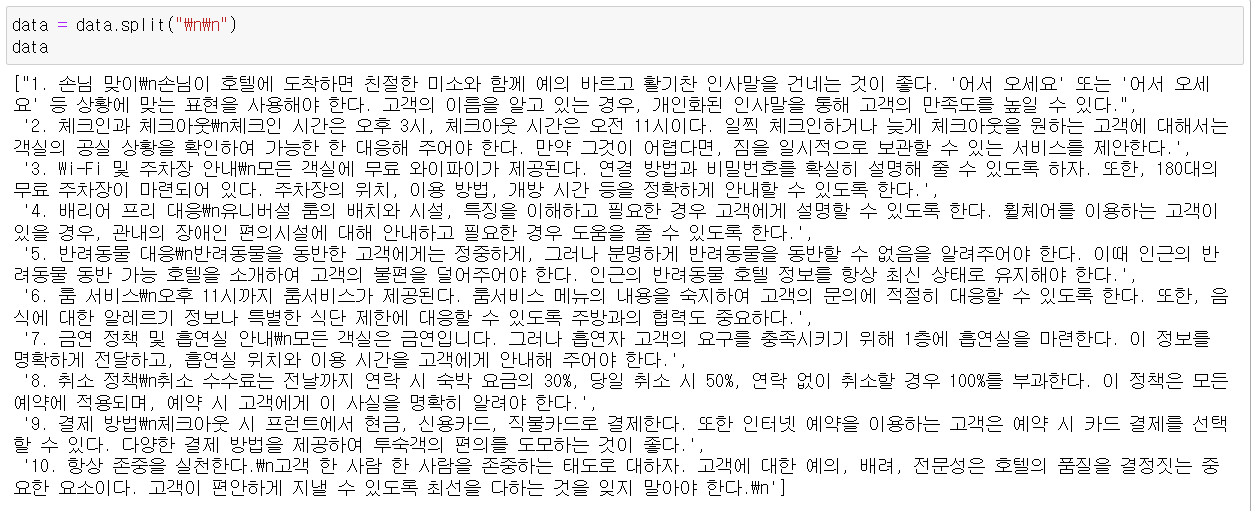jupyter notebook에서 print문 없이 변수를 출력하면 이스케이프문자가 보인다. 1.손님 맞이 같은 제목과 손님이 호텔에 도착하면.. 의 사이는 \n 로 구분되고 각 항목은 \n\n으로 구분되는 것을 볼 수 있다.